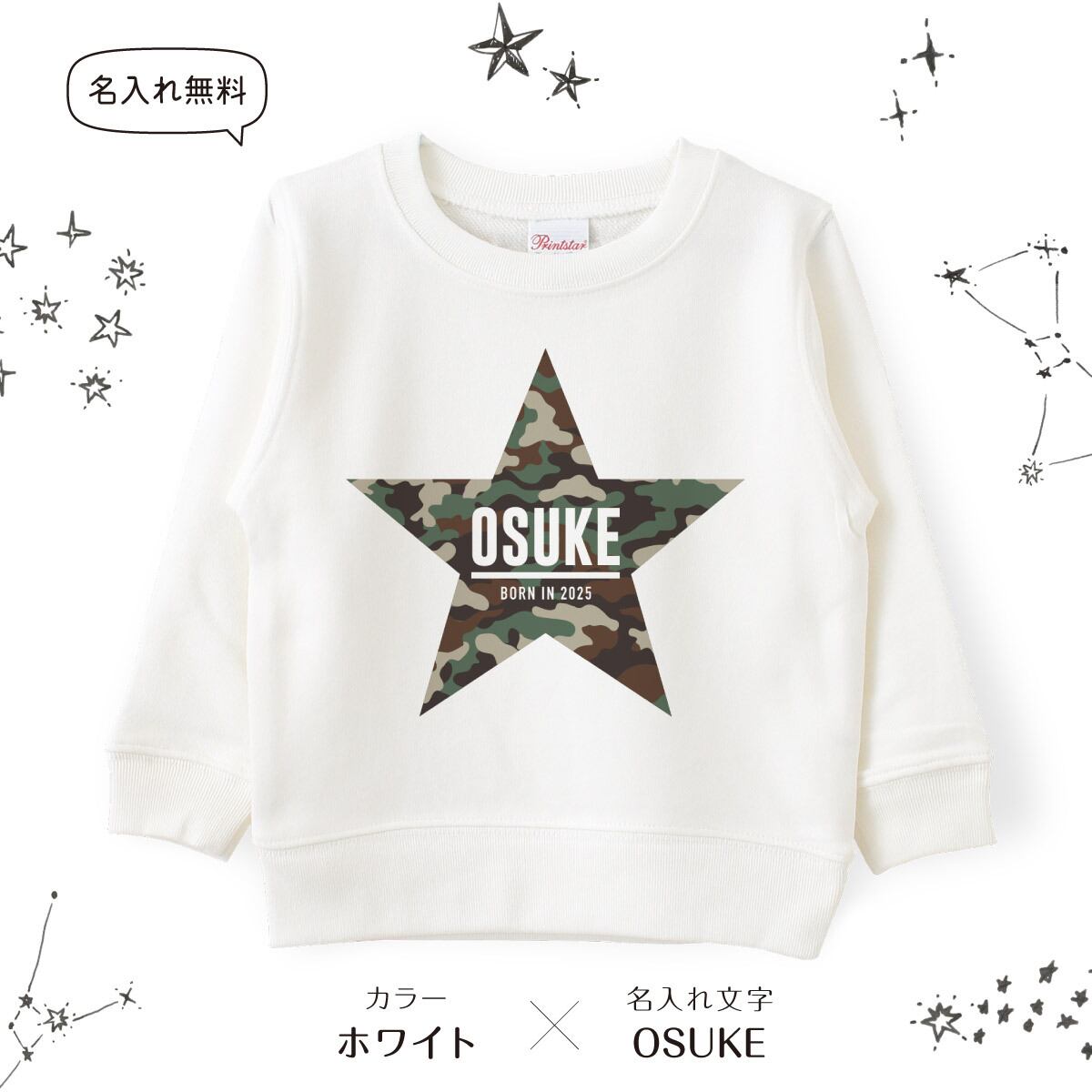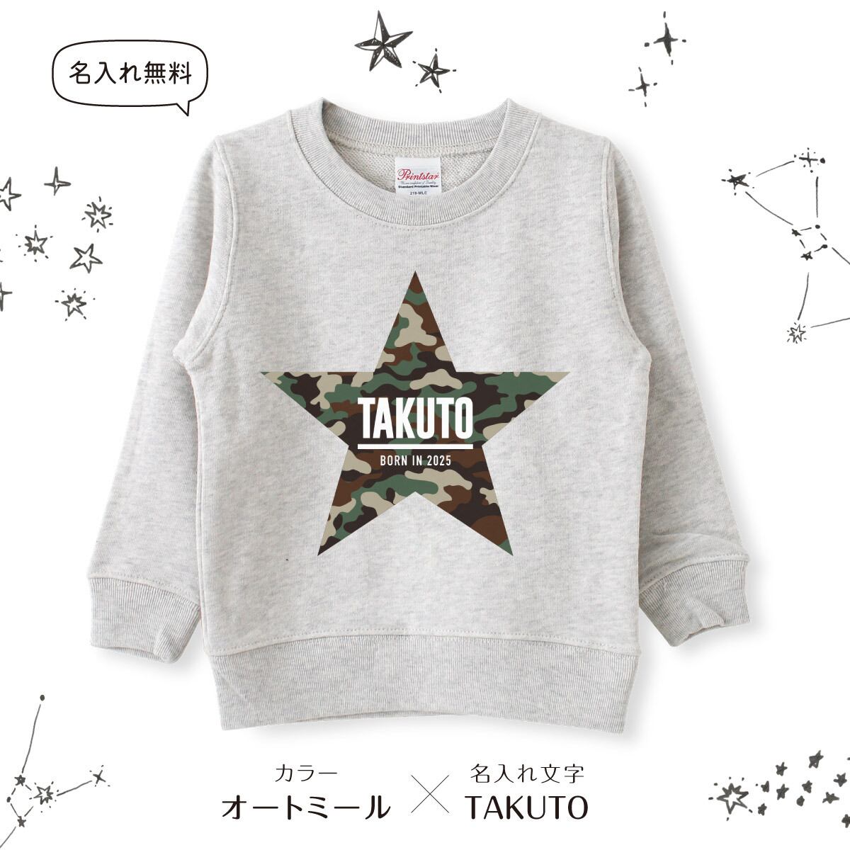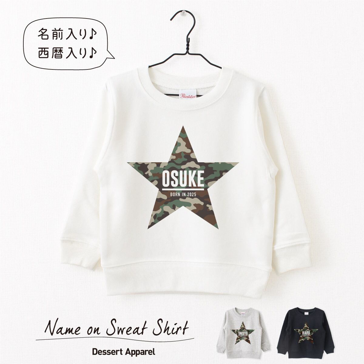 キッズ トレーナー 名入れ 迷彩柄スター01 スウェット 100 110 120 130 140 150 子供服 ジュニア 子ども おしゃれ かわいい 人気 名前入り ネーム バースデー 男女 ギフト 誕生日 プレゼント おそろ 兄弟 姉妹 親子コーデ 双子 記念撮影 幼稚園 保育園 小学校 スポーツ | Dessert Apparel