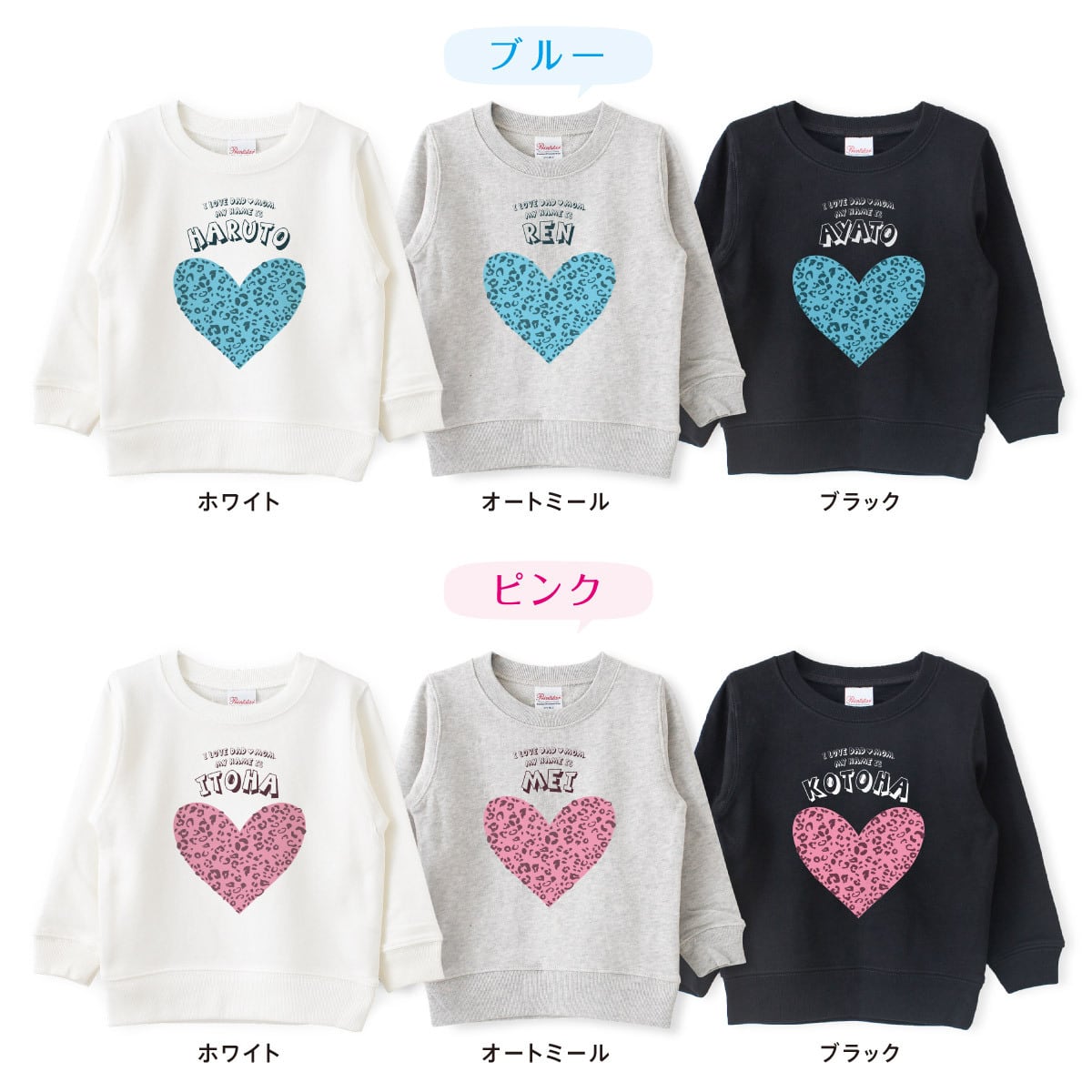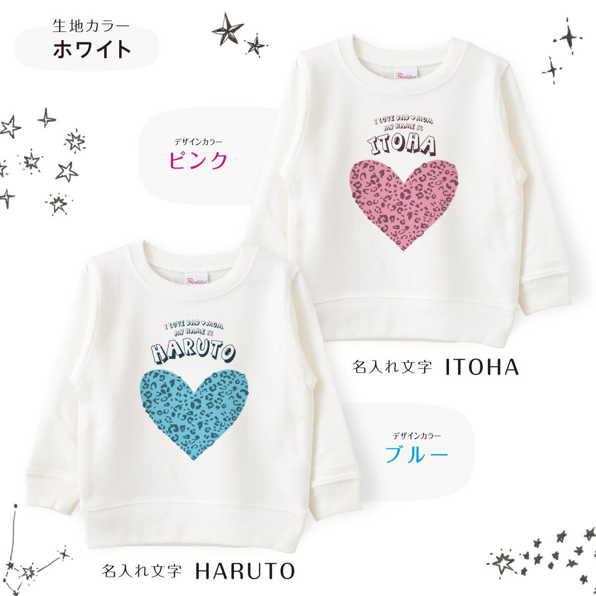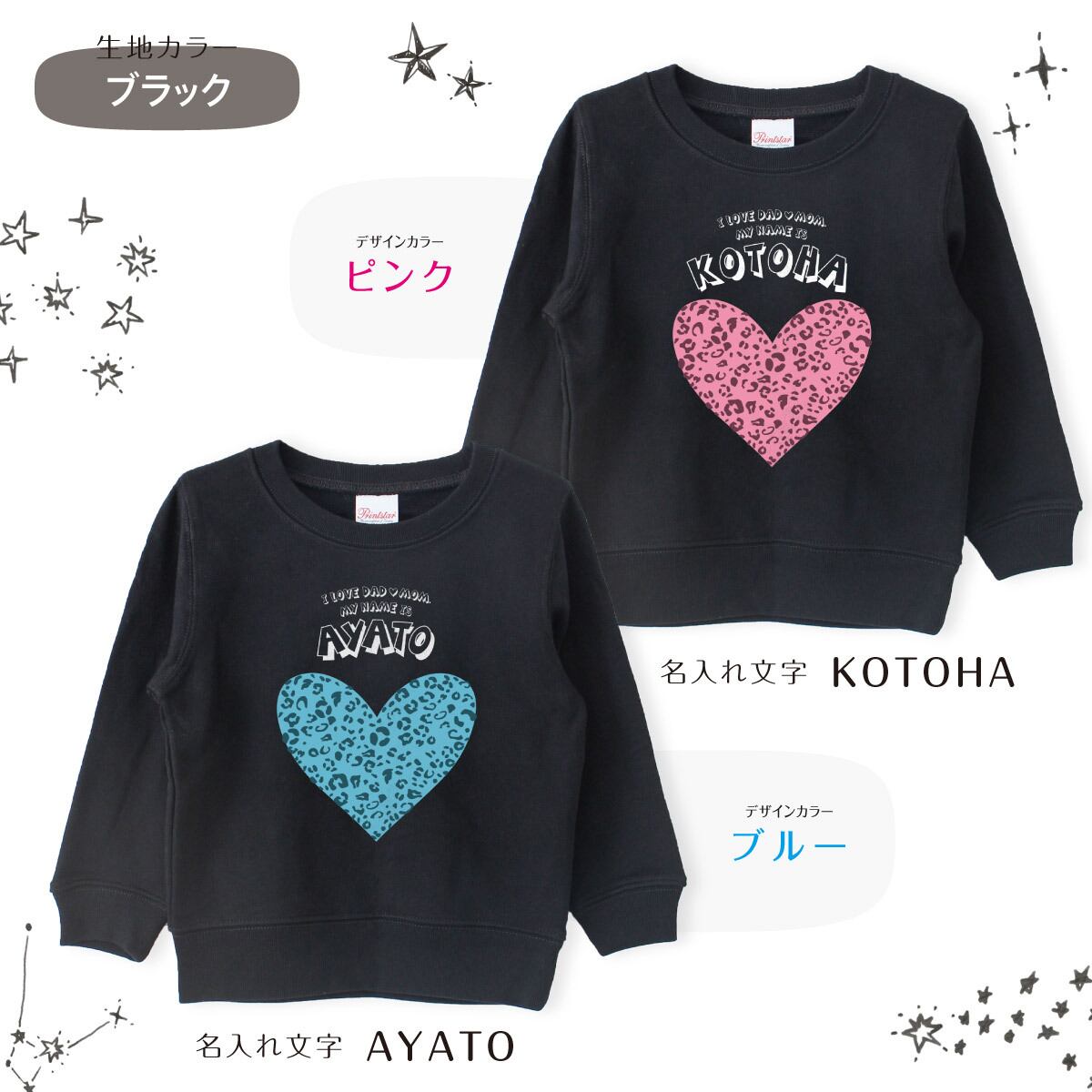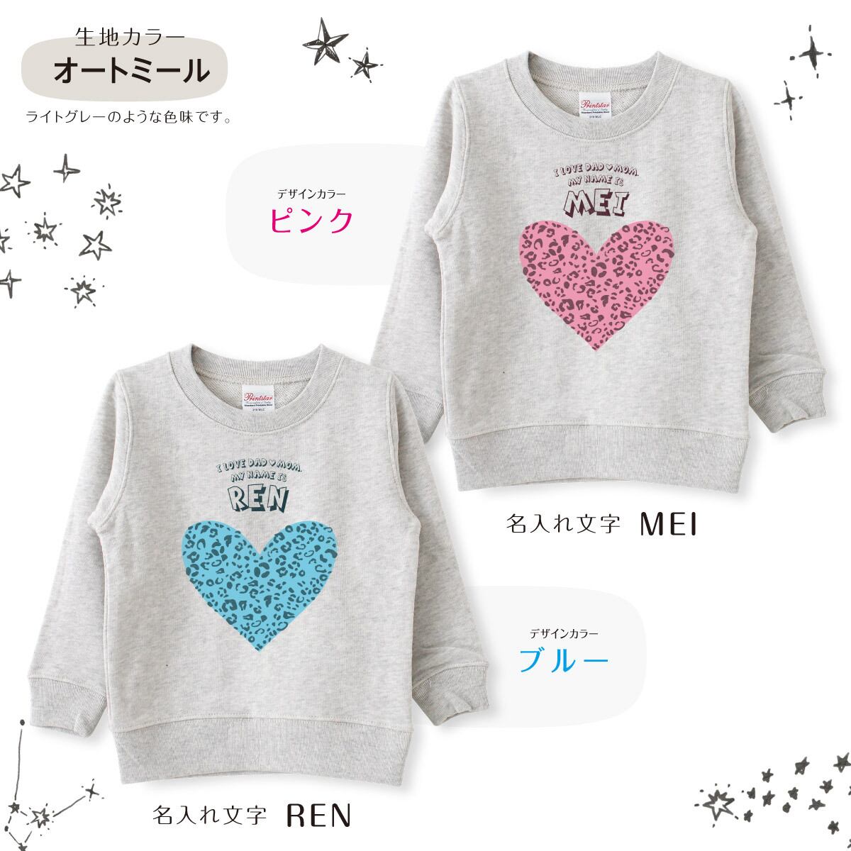 キッズ トレーナー 名入れ ハート04 レオパード柄 ヒョウ柄 スウェット 100 110 120 130 140 150 子ども おしゃれ かわいい 人気 名前入り ネーム バースデー 男女 ギフト 誕生日 プレゼント おそろ 兄弟 姉妹 親子コーデ 双子 記念撮影 幼稚園 保育園 小学校 スポーツ | Dessert Apparel