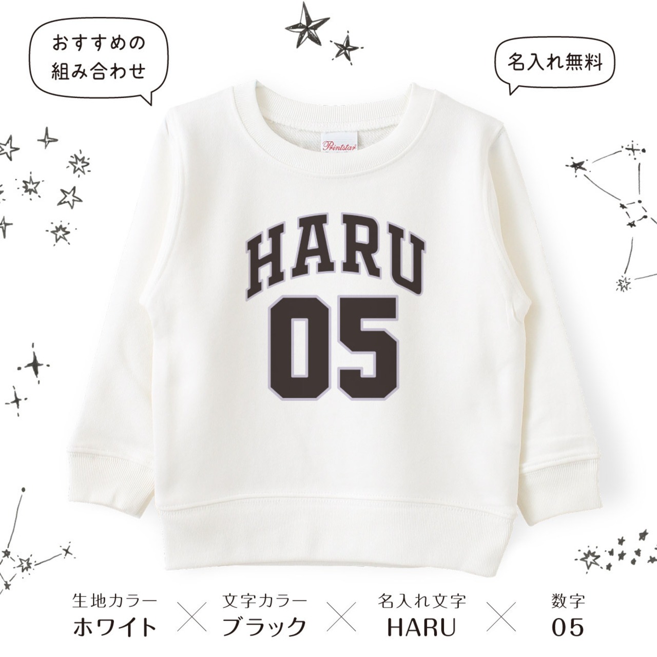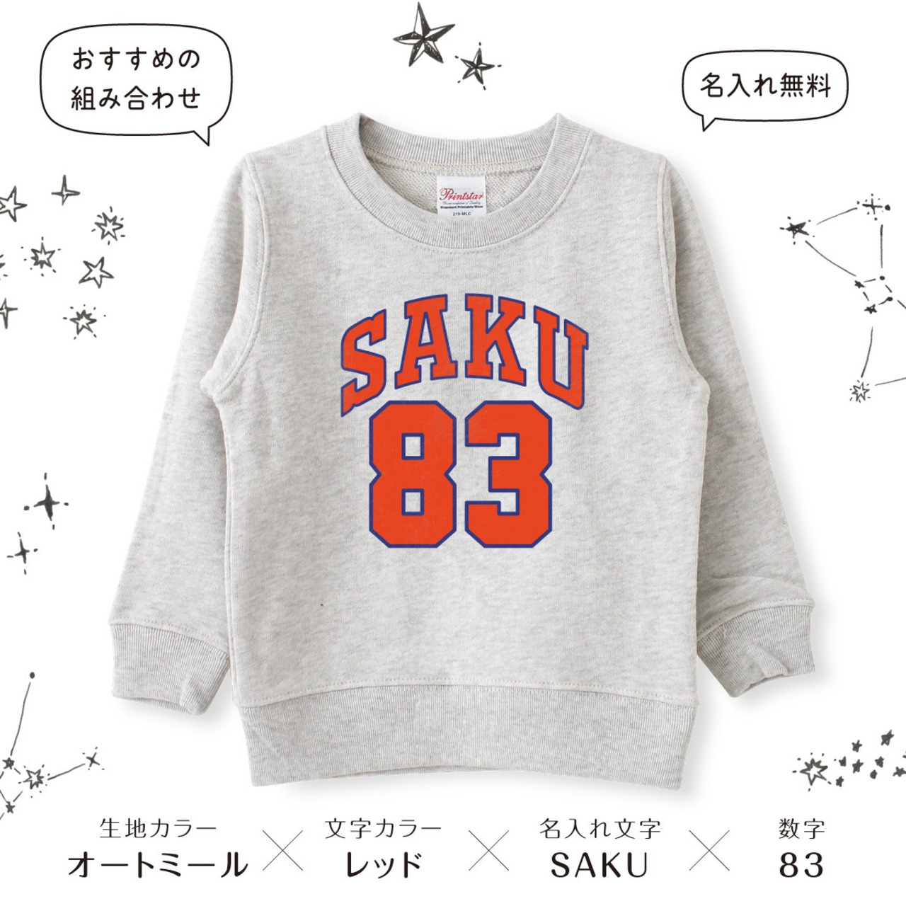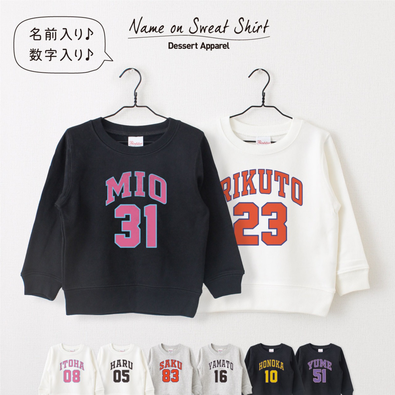 キッズ トレーナー 名入れ ユニフォーム01 カレッジロゴ アメカジ ナンバー スウェット 100 110 120 130 140 150 子供服 ジュニア 子ども おしゃれ かわいい 人気 名前入り ネーム バースデー おそろ 兄弟 姉妹 親子コーデ 双子 記念撮影 幼稚園 保育園 小学校 スポーツ | Dessert Apparel