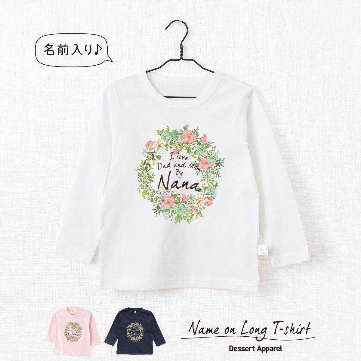 【長袖Tシャツ】名入れ キッズ ベビー フラワー01 リース 花 ロンティー 80 90 100 110 130 140 150 名前入り 出産祝い ギフト 誕生日 プレゼント 男の子 女の子 バースデー おしゃれ かわいい 人気 おそろい 兄弟 姉妹 親子コーデ 双子 運動会 記念撮影 幼稚園 保育園 | Dessert Apparel
