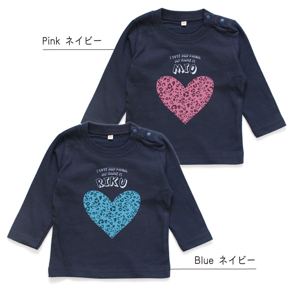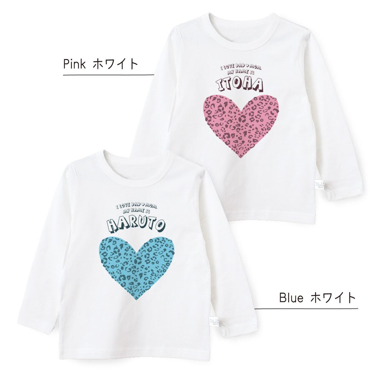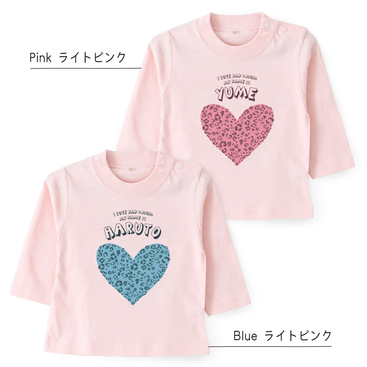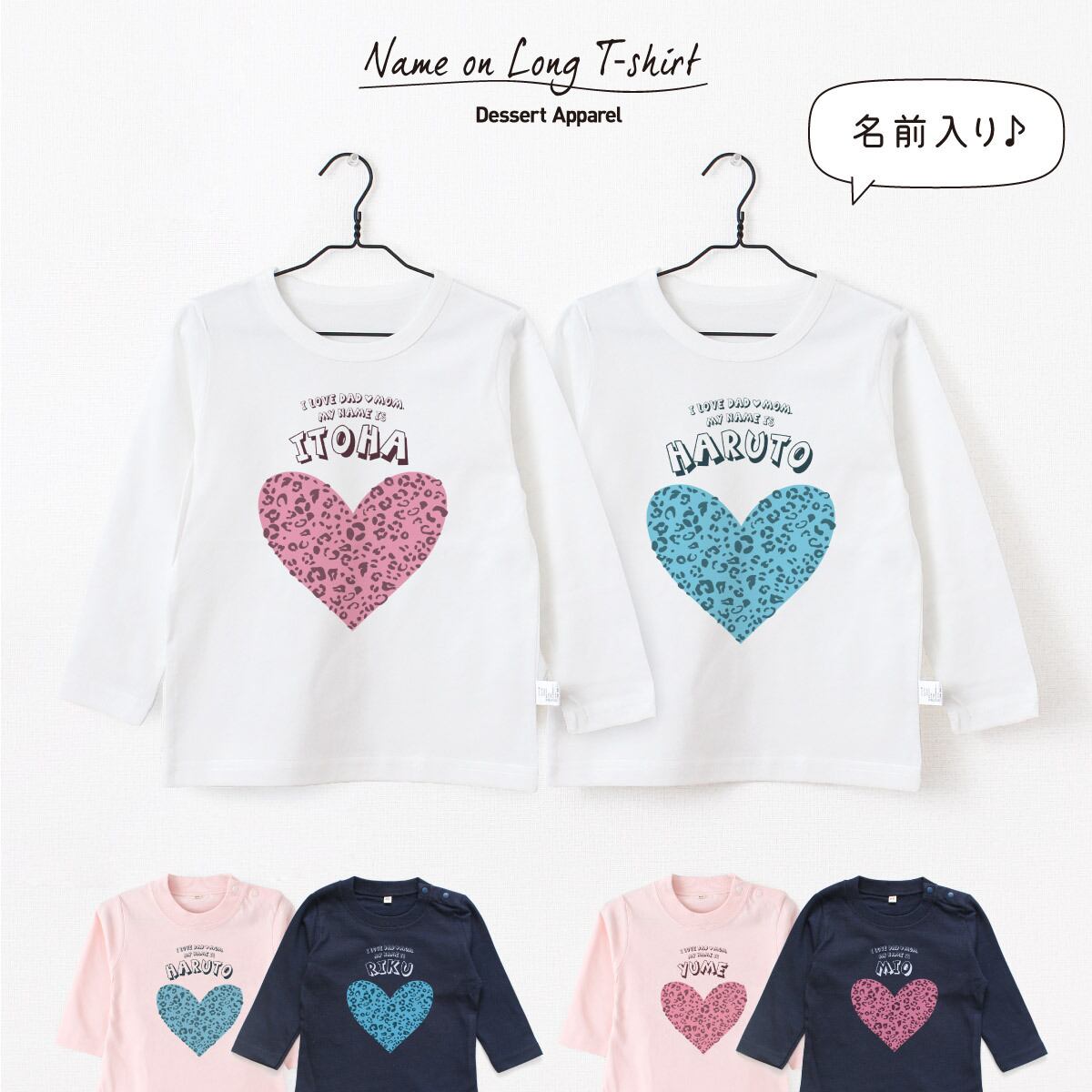 【長袖Tシャツ】名入れ キッズ ベビー ハート04 レオパード柄 ヒョウ柄 80 90 100 110 130 140 150 ロンティー 名前入り 出産祝い ギフト 誕生日 プレゼント 男女 バースデー おしゃれ かわいい 人気 おそろい 兄弟 姉妹 親子コーデ 双子 運動会 記念撮影 幼稚園 保育園 | Dessert Apparel