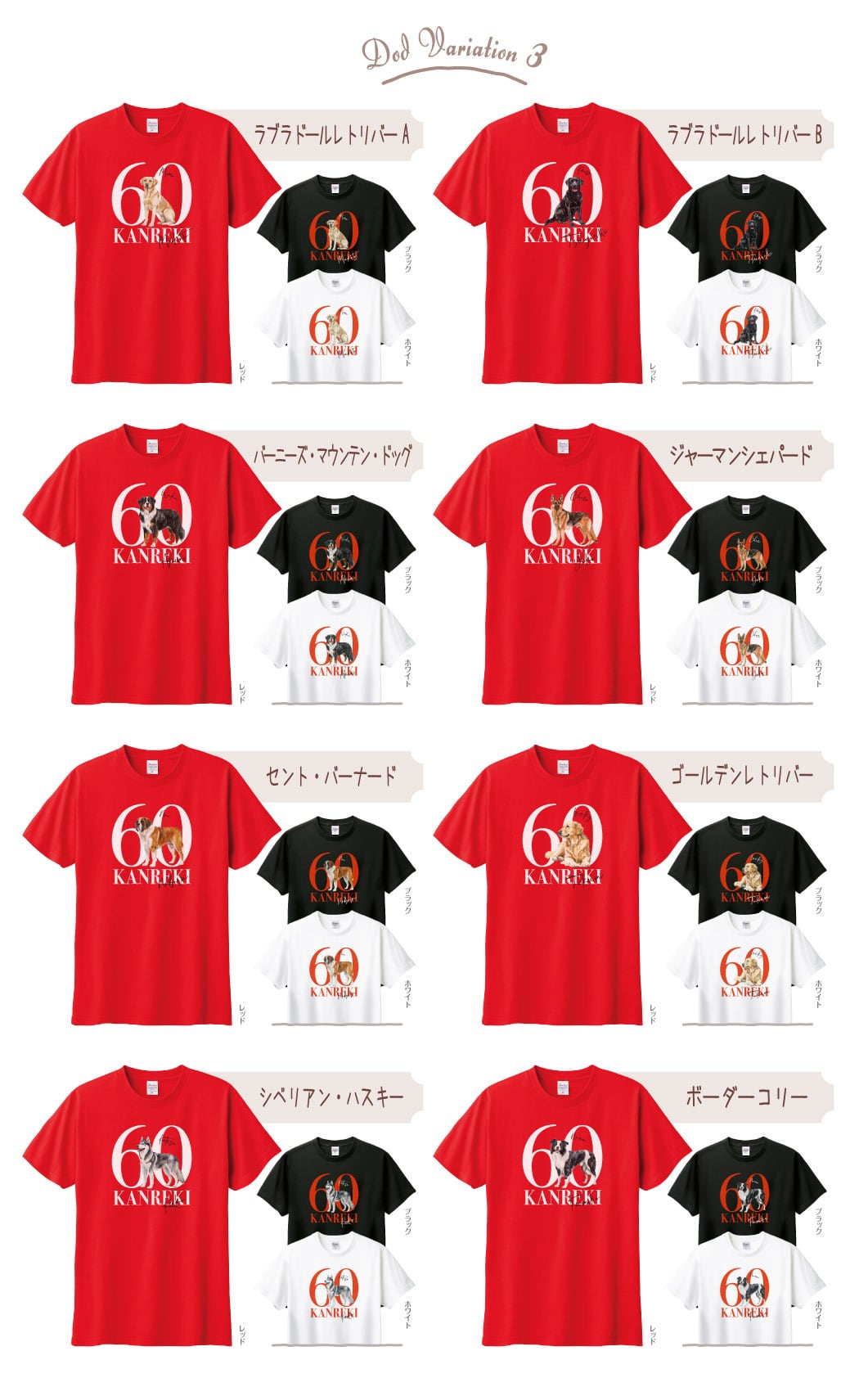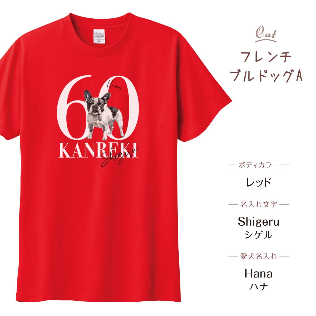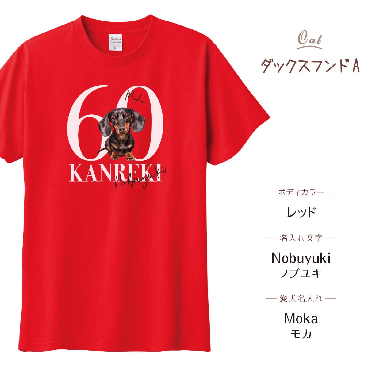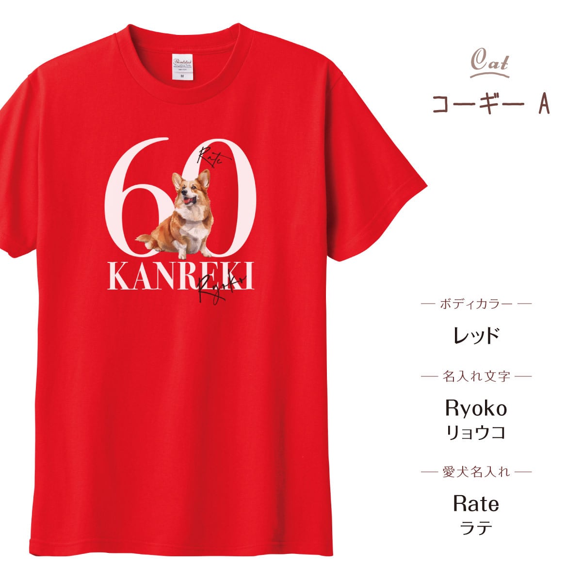 可愛いワンちゃんの名入れができる、名入れ無料の還暦Tシャツです。