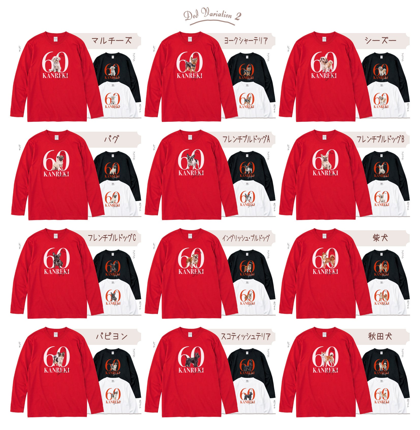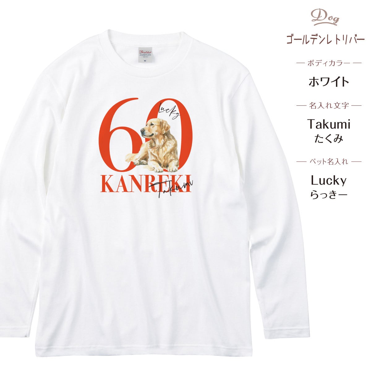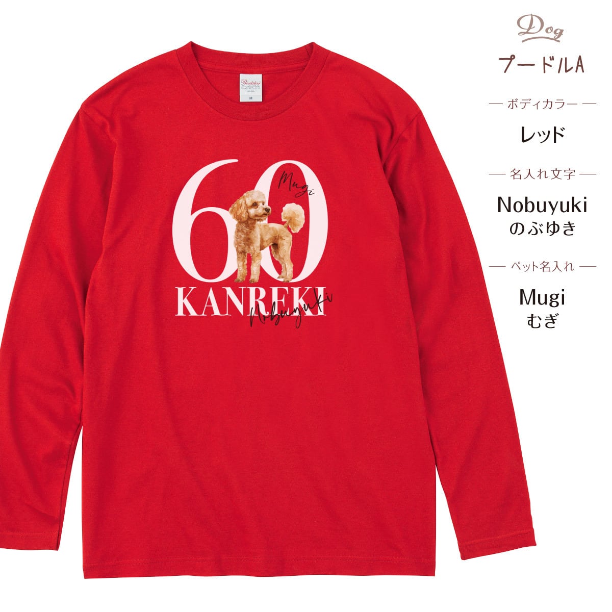 可愛いワンちゃんの名入れができる、名入れ無料の還暦Tシャツです。