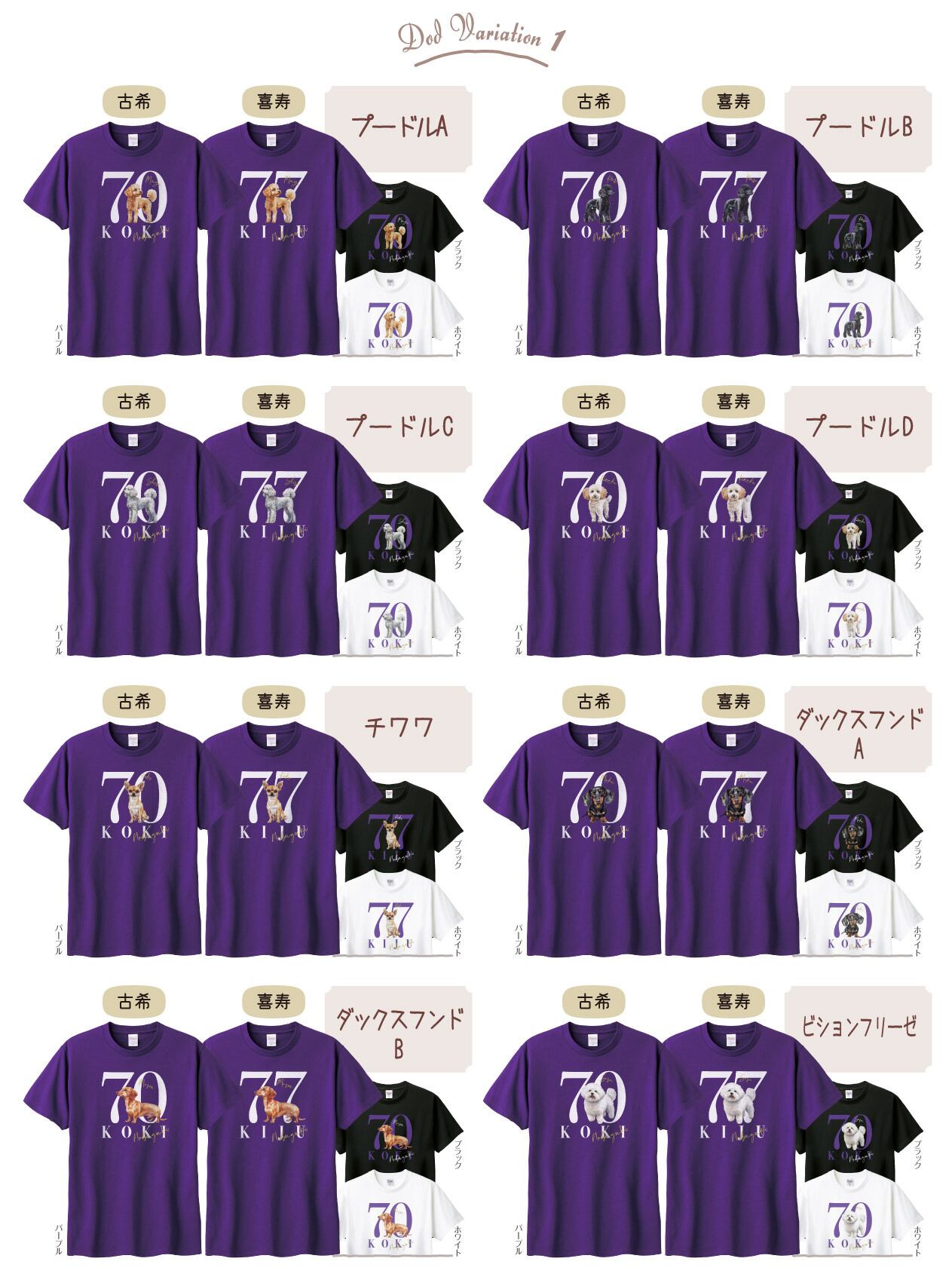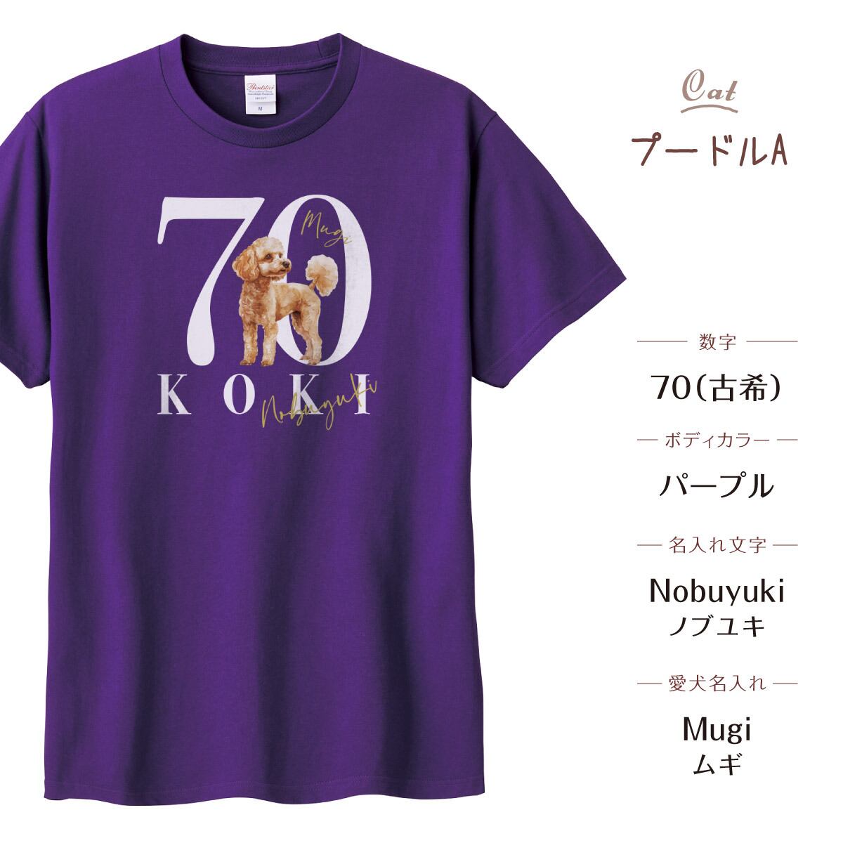 名入れと愛犬の名入れもできる、オリジナル名入れ古希Tシャツ、喜寿Tシャツです。