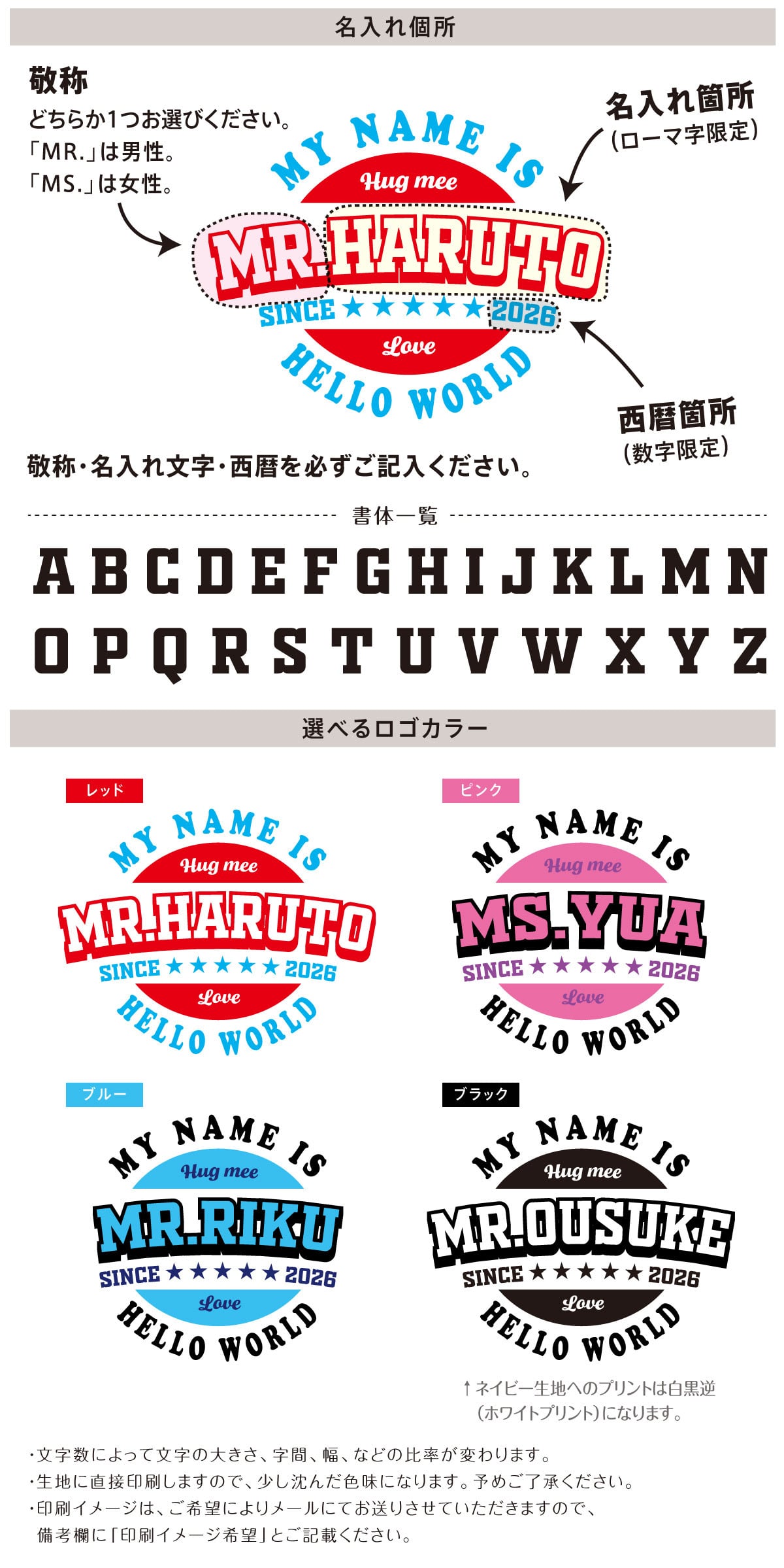 ・必ずプリントする【お名前(ローマ字)】を備考欄かメッセージ欄にご記入ください。