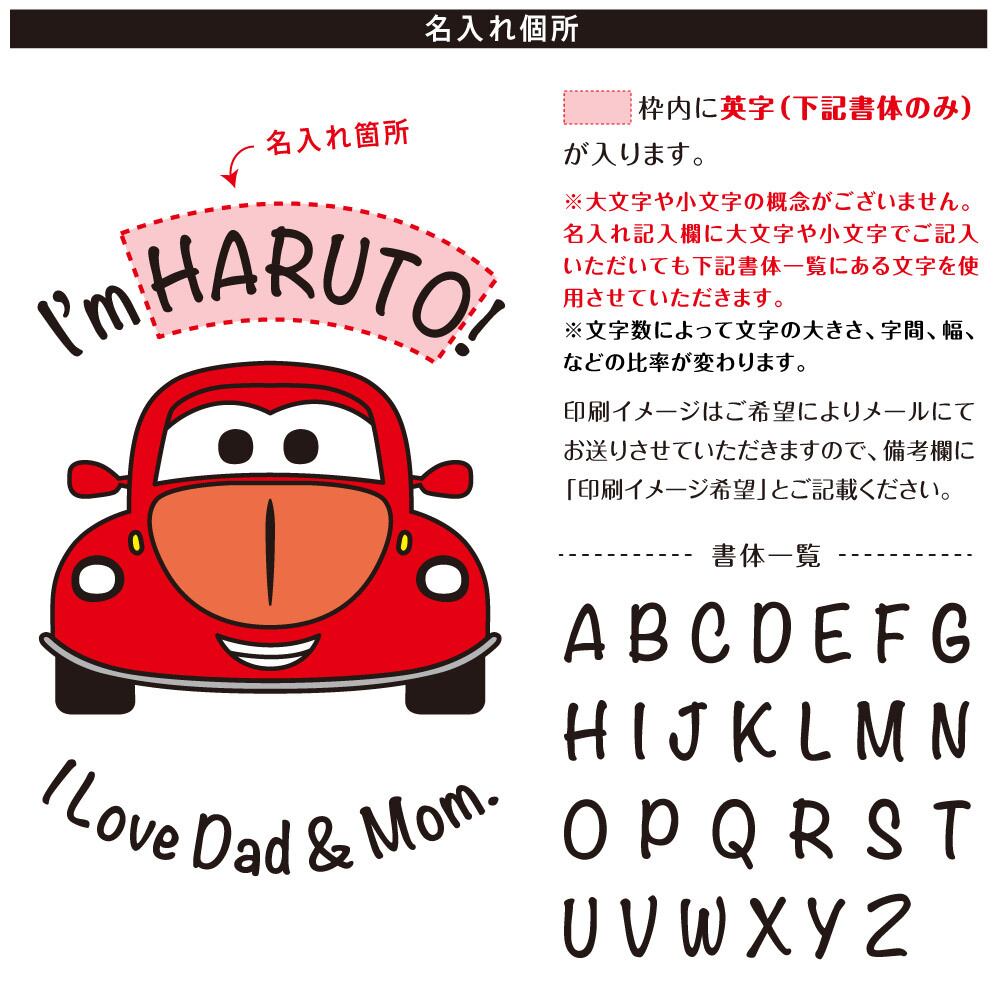 ・プリントする文字は商品画像「名入れ箇所」の「書体一覧」を必ずご確認ください。書体一覧に表示されている文字しか対応できませんので、予めご了承ください。