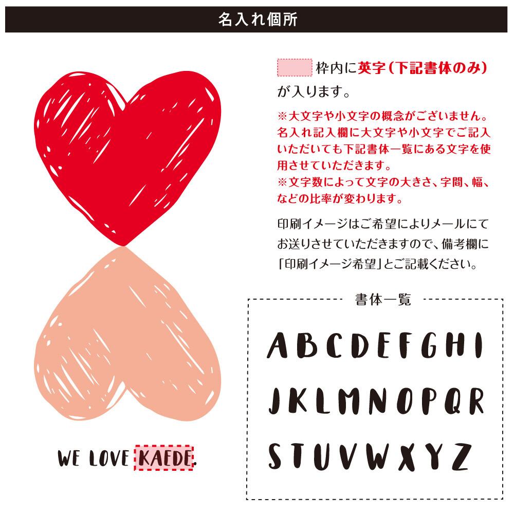 ・プリントする文字は商品画像「名入れ箇所」の「書体一覧」を必ずご確認ください。書体一覧に表示されている文字しか対応できませんので、予めご了承ください。