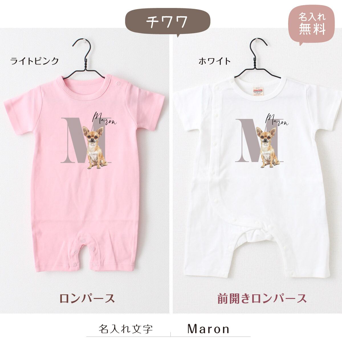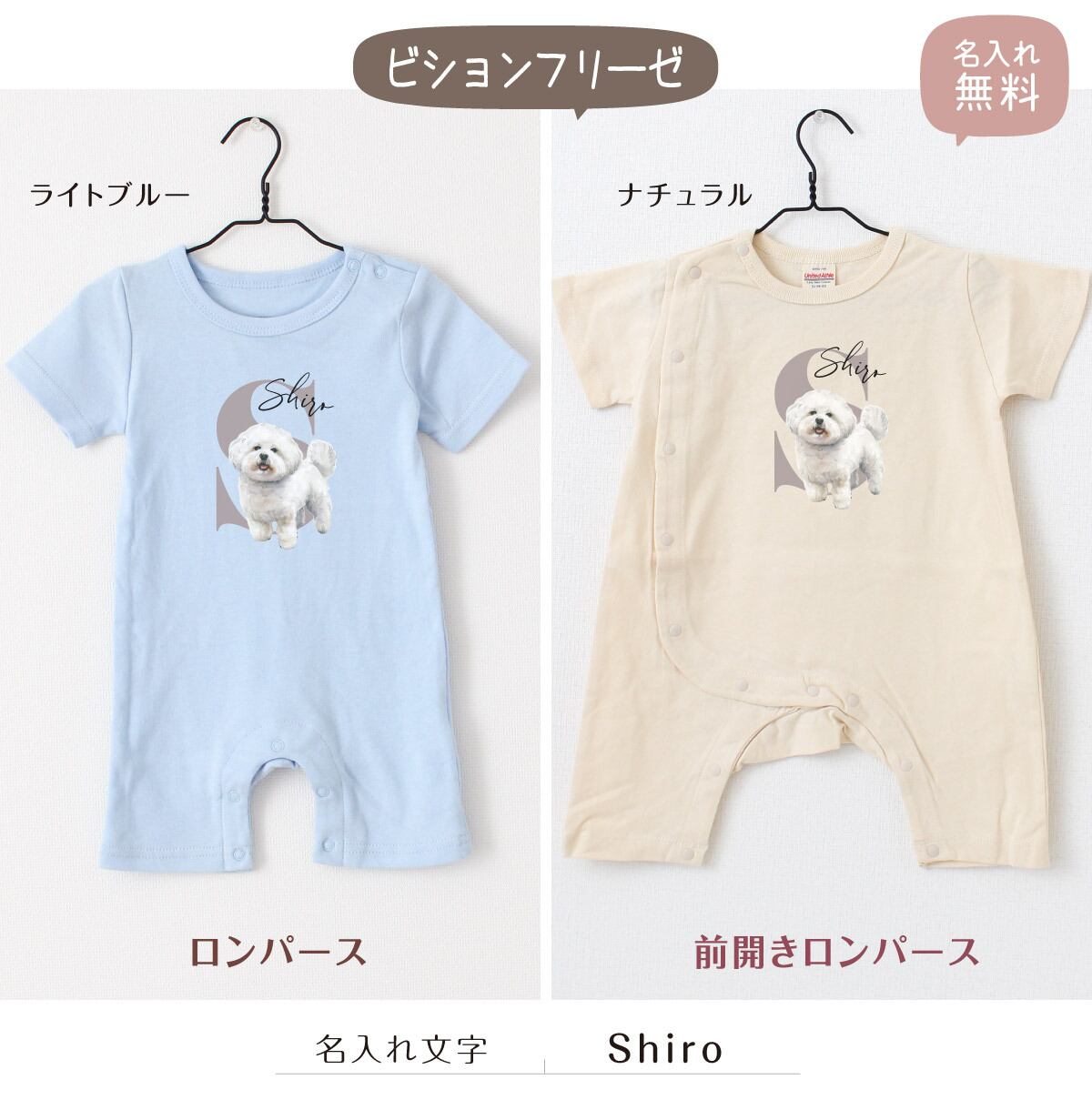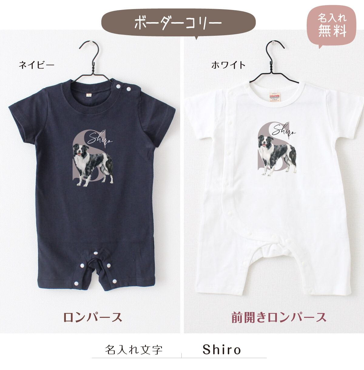 可愛いワンちゃんの名入れができる、オリジナル名前入れベビーロンパース!