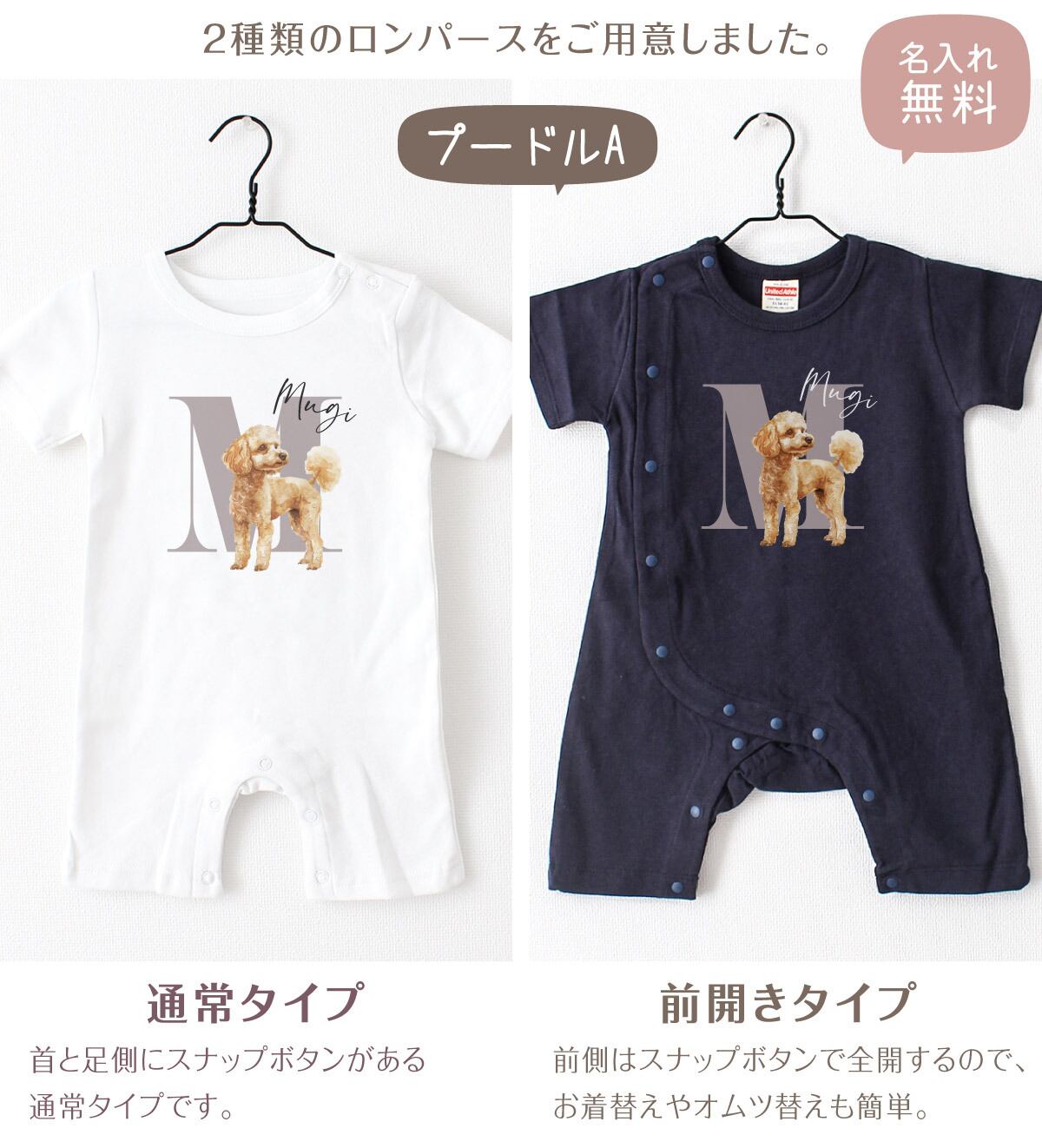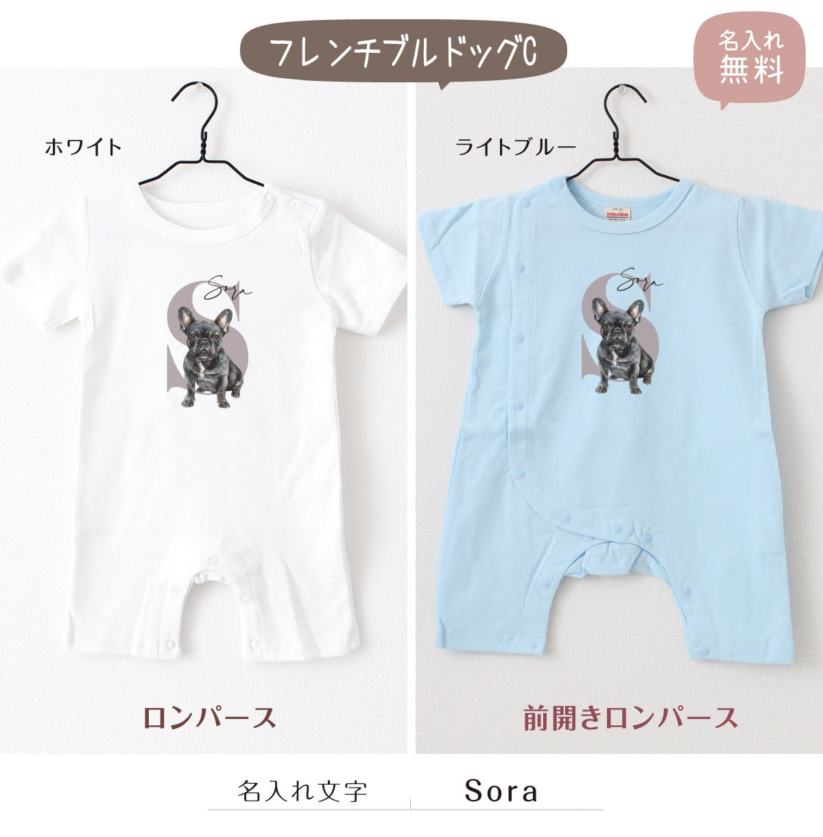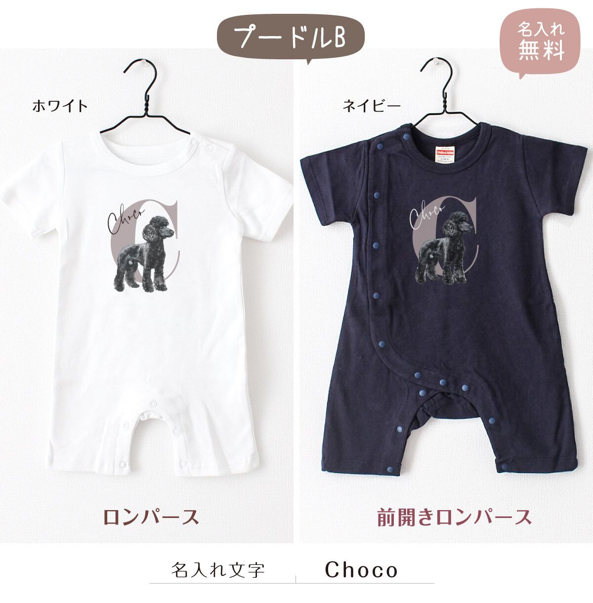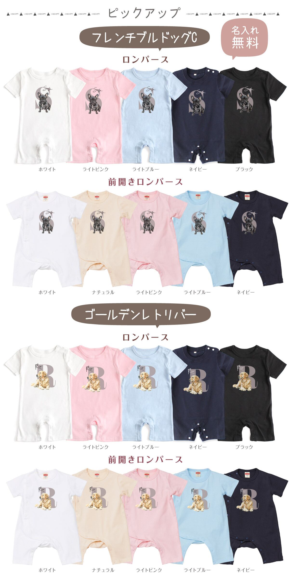 可愛いワンちゃんの名入れができる、オリジナル名前入れベビーロンパース!
