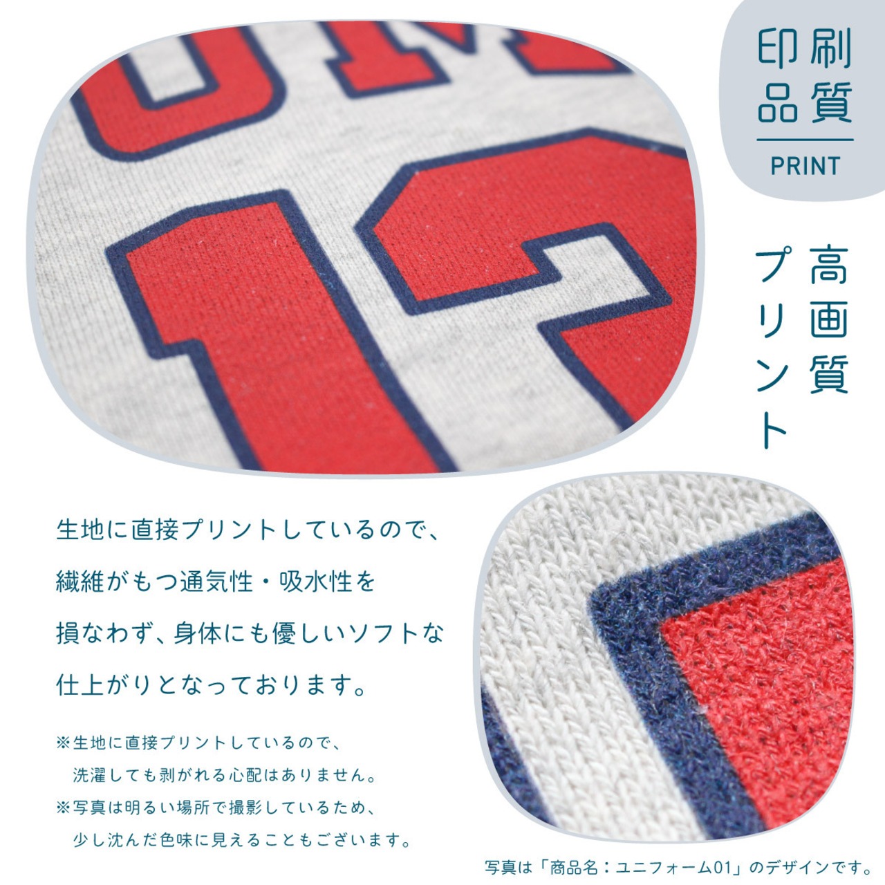 生地に直接プリントしますので、繊維が持つ通気性・吸水性を損なわず、お子様の体にも優しいソフトな仕上がりとなっております。