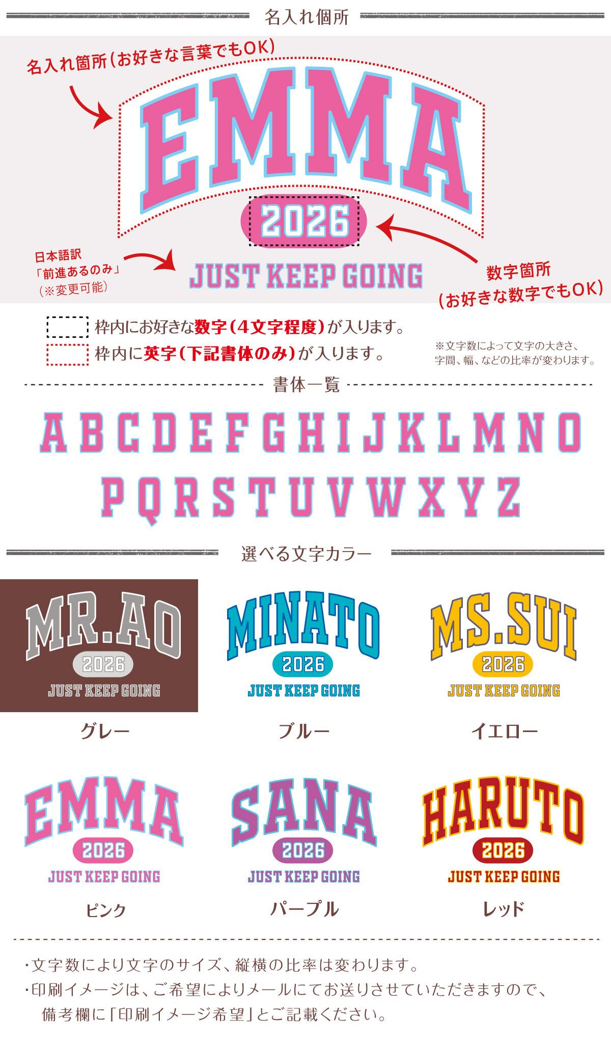 ・必ずプリントする【お名前(ローマ字)】を備考欄かメッセージ欄にご記入ください。