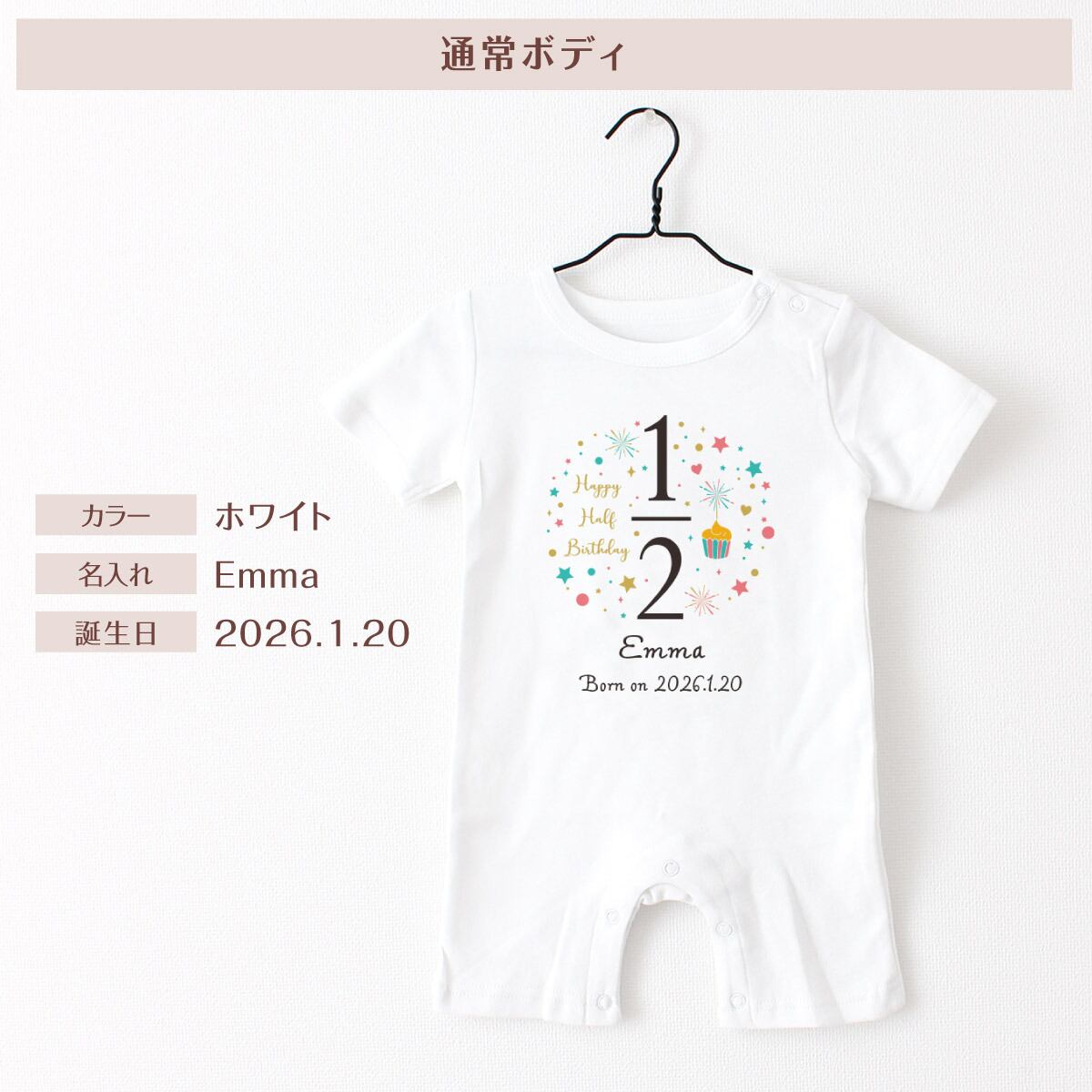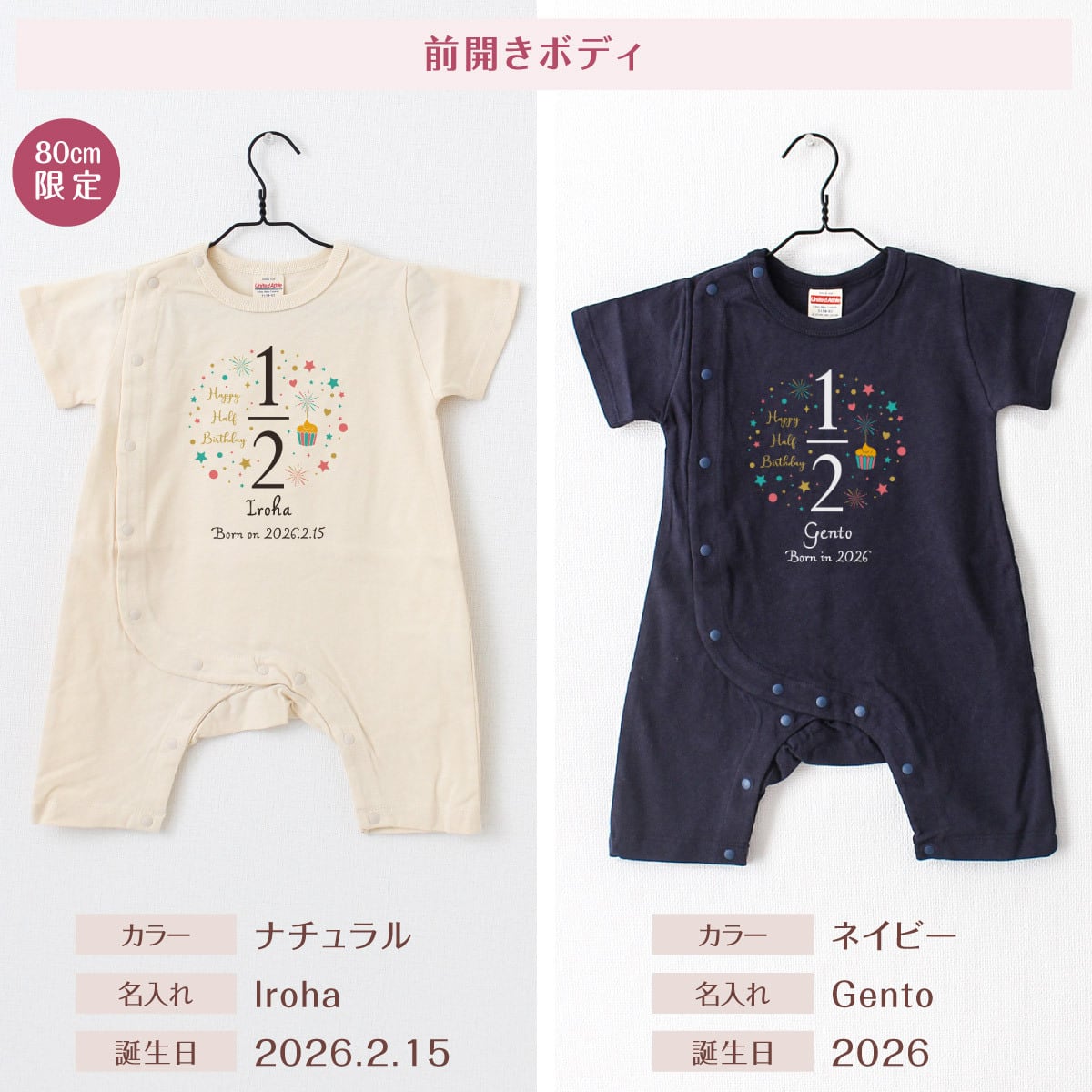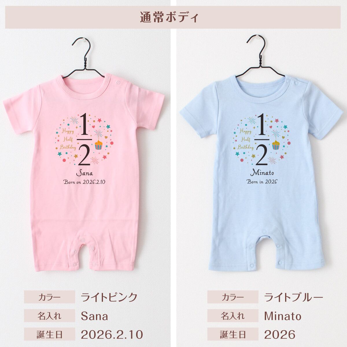 出産祝い 名入れ ロンパース ハーフバースデー02 ベビー服 70cm 80cm 誕生日 お祝い プレゼント ギフト 名前入れ バースデー イニシャル ネーム おしゃれ かわいい お洒落 可愛い バースデー 赤ちゃん服 人気 おそろい 双子 兄弟 姉妹 男の子 女の子 メール便送料無料