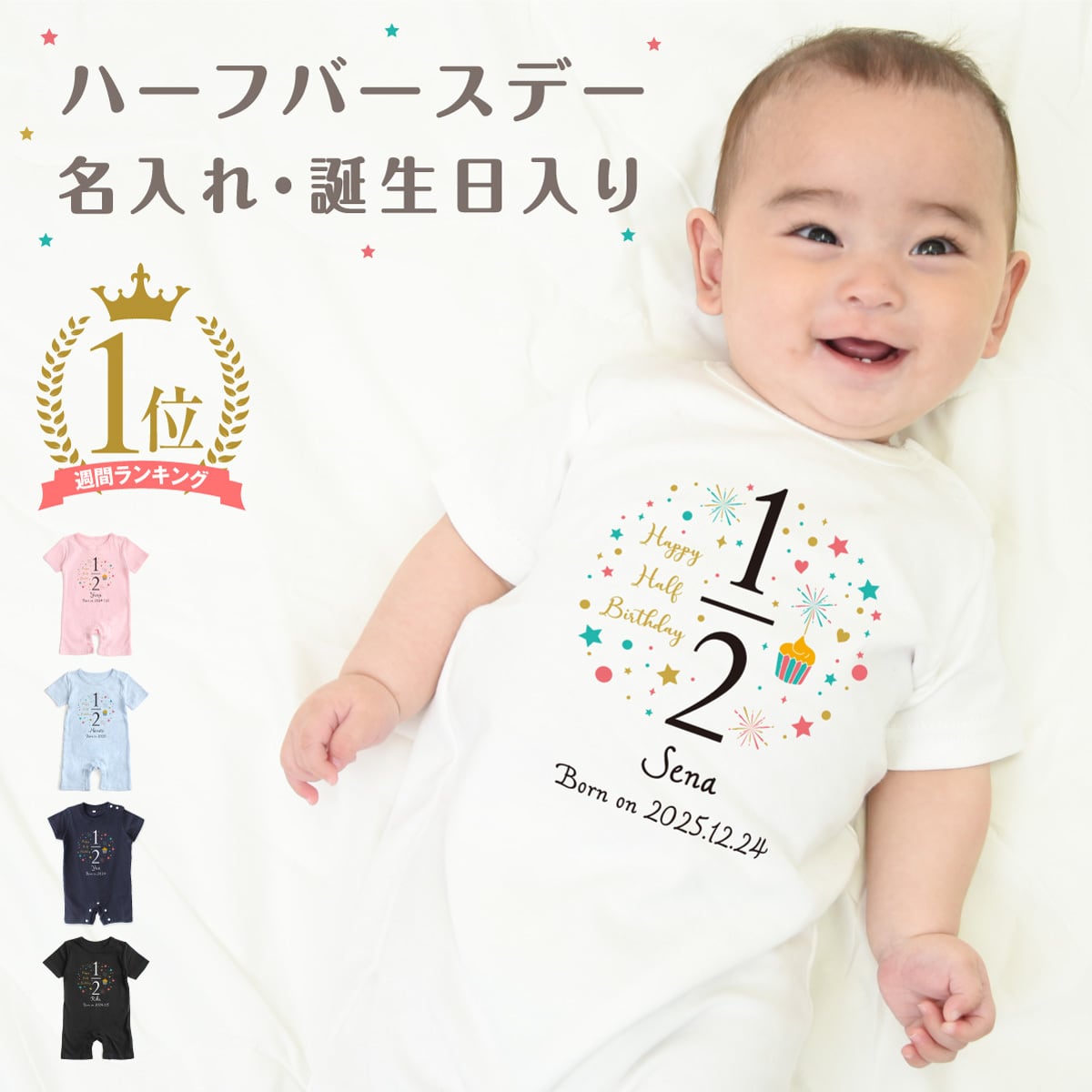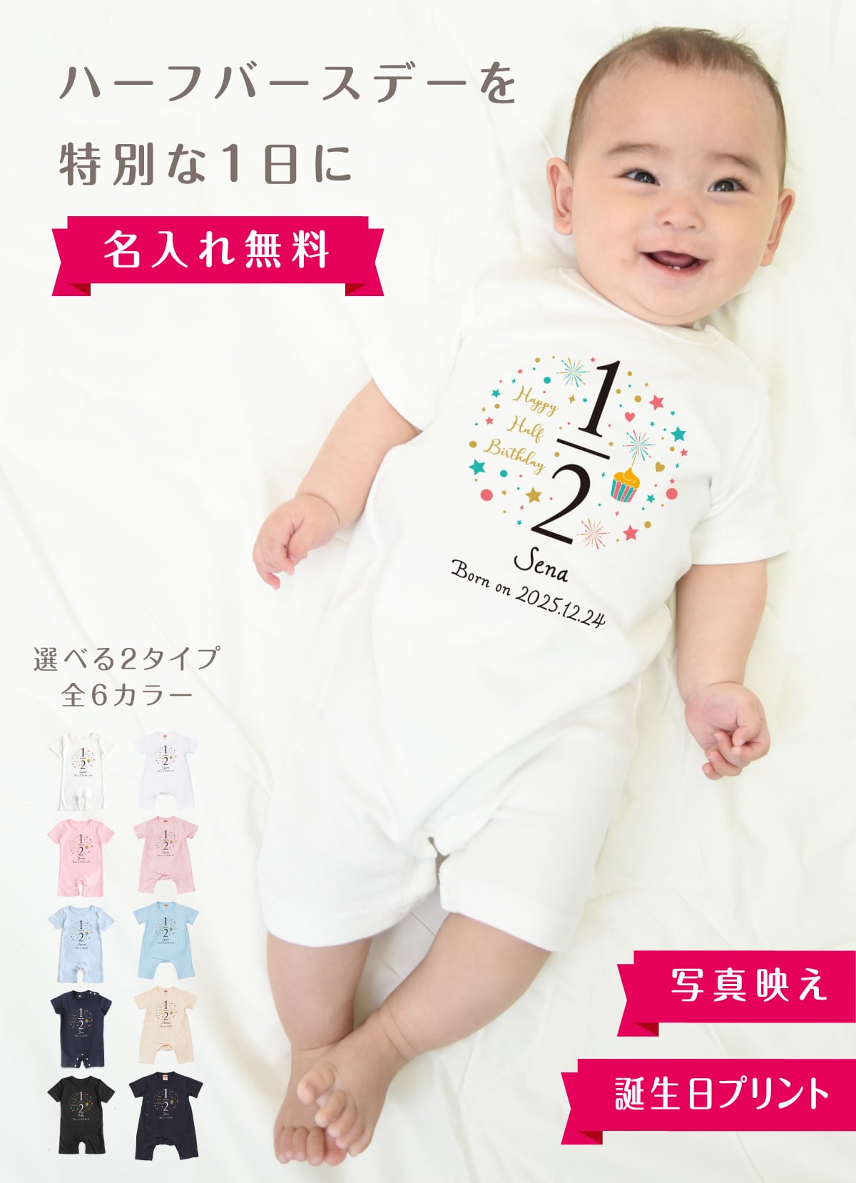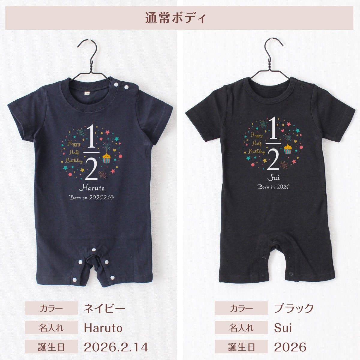 出産祝い 名入れ ロンパース ハーフバースデー02 ベビー服 70cm 80cm 誕生日 お祝い プレゼント ギフト 名前入れ バースデー イニシャル ネーム おしゃれ かわいい お洒落 可愛い バースデー 赤ちゃん服 人気 おそろい 双子 兄弟 姉妹 男の子 女の子 メール便送料無料