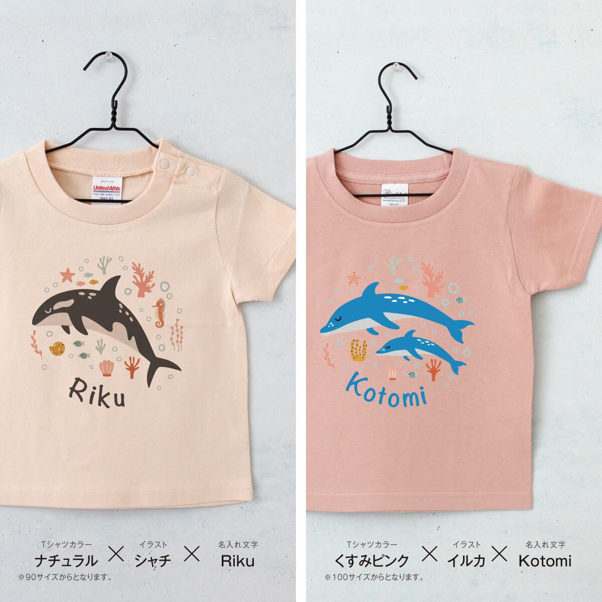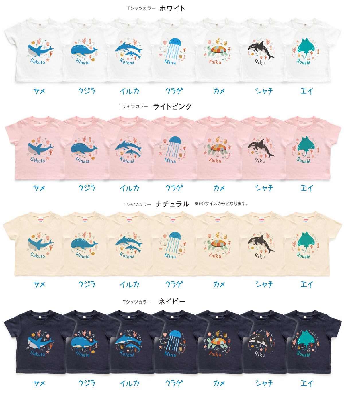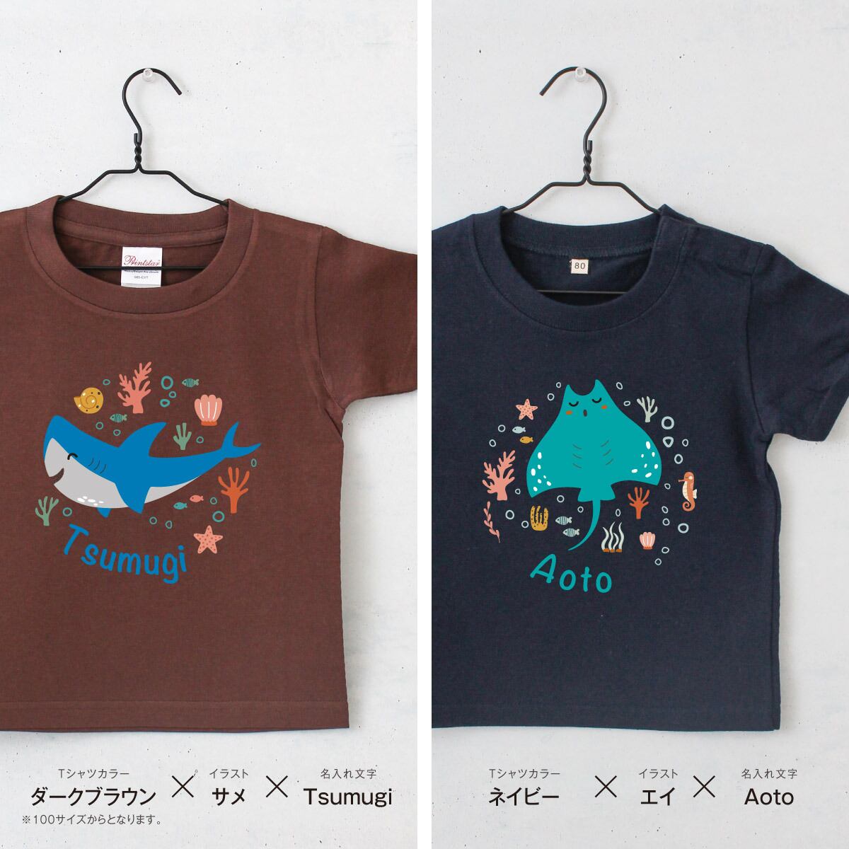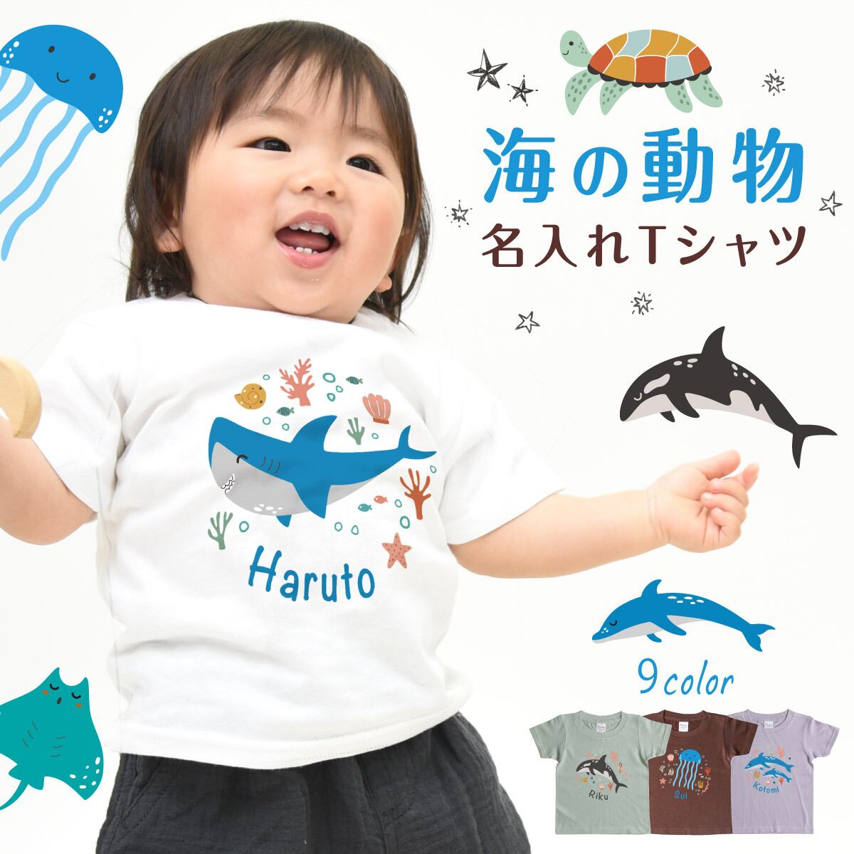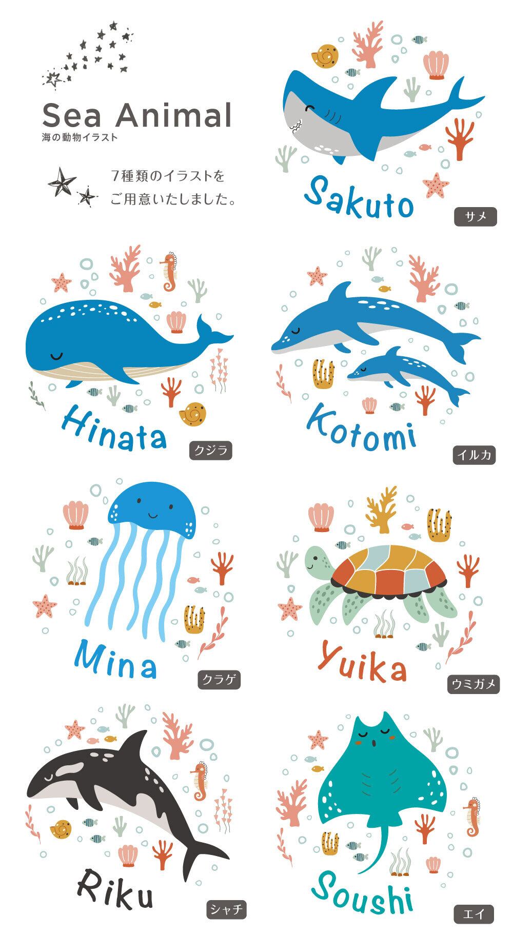 Tシャツ 名入れ キッズ ベビー シーアニマル01 海の動物イラスト サメ クジラ イルカ クラゲ ウミガメ シャチ エイ 名前入り 80 90 100 110 120 130 140 150 出産祝い ギフト 誕生日 プレゼント 男の子 女の子 バースデー 赤ちゃん服 子供服 ジュニア ネーム おしゃれ かわいい 人気 おそろい 双子 兄弟 姉妹 運動会 記念撮影