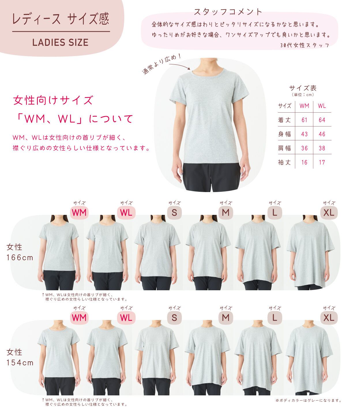 ・WMサイズ(ウーマンM):身丈61/身巾43/肩巾36/袖丈16