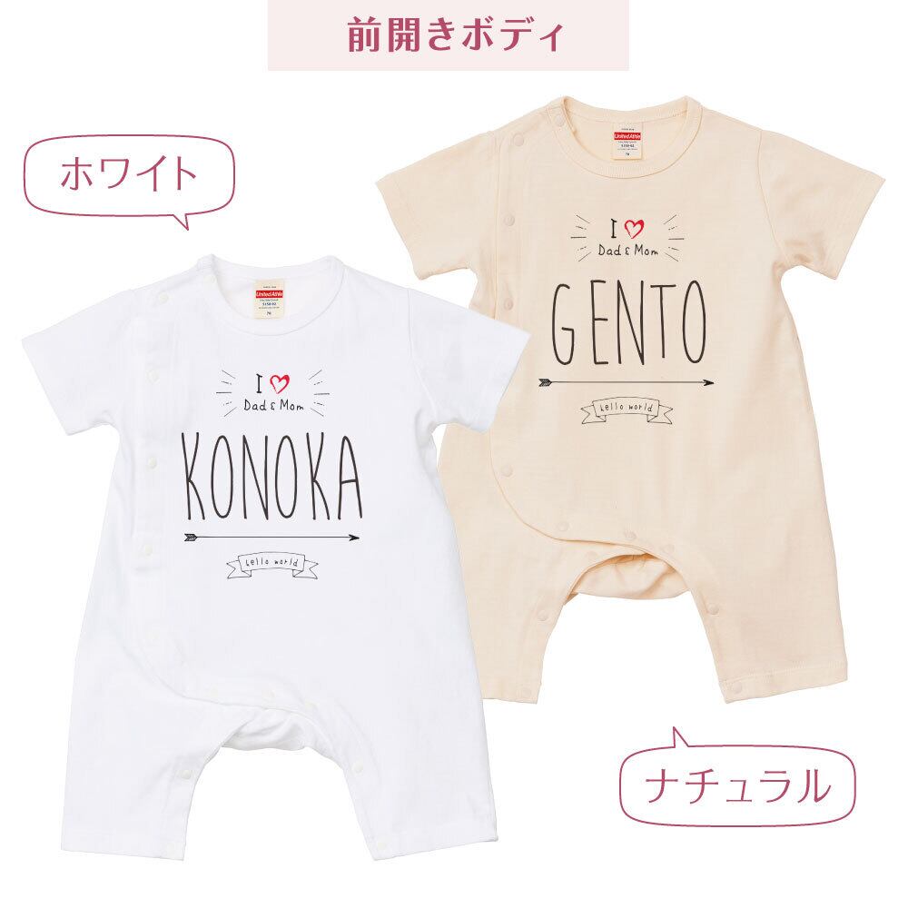 出産祝い 名入れ ロンパース I love Dad & Mom ベビー服 70cm 80cm 誕生日 お祝い プレゼント ギフト 名前入れ ハーフバースデーフォト おしゃれ かわいい お洒落 可愛い 赤ちゃん服 人気 おそろい 双子コーデ 兄弟 姉妹 男の子 女の子 記念撮影 内祝 親子コーデ | Dessert Apparel